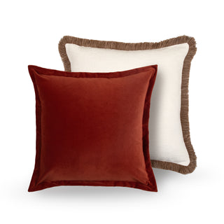 Rust orange and elegant Oxford edge cuff gives this velvet cushion extra flare and interest. A subtle cream boucle fabric embellished with our double multi tonal Clove fringe. This is the perfect partner for this rust orange velvet cushion.