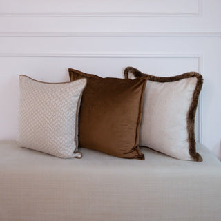 A rich chestnut brown and elegant Oxford edge cuff gives this velvet cushion extra flare and interest. This staple acts as an amazing backdrop to a lighter cushion from our collection.